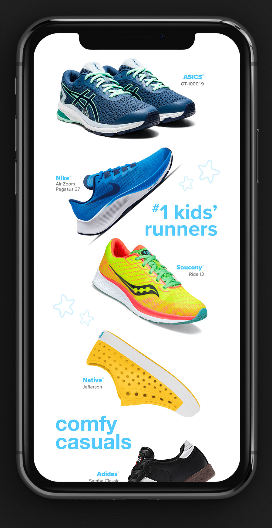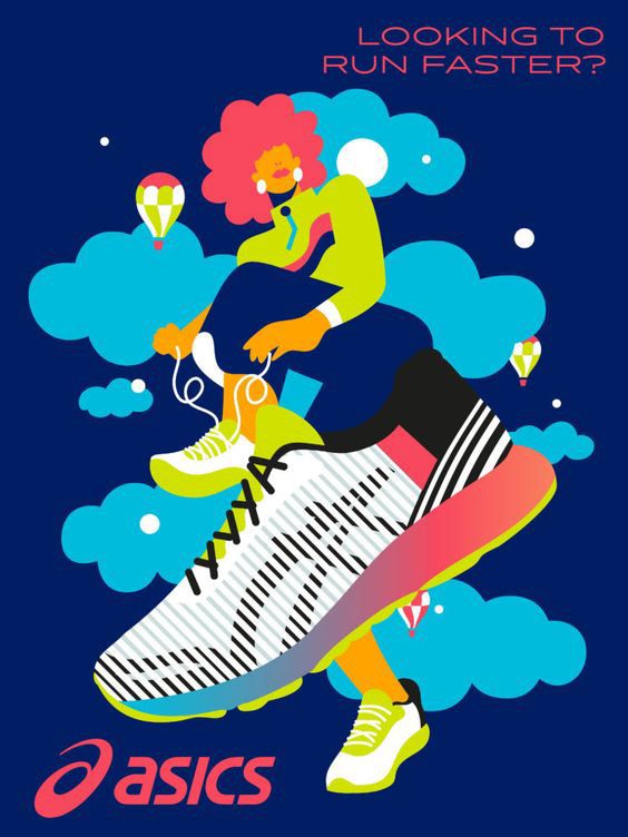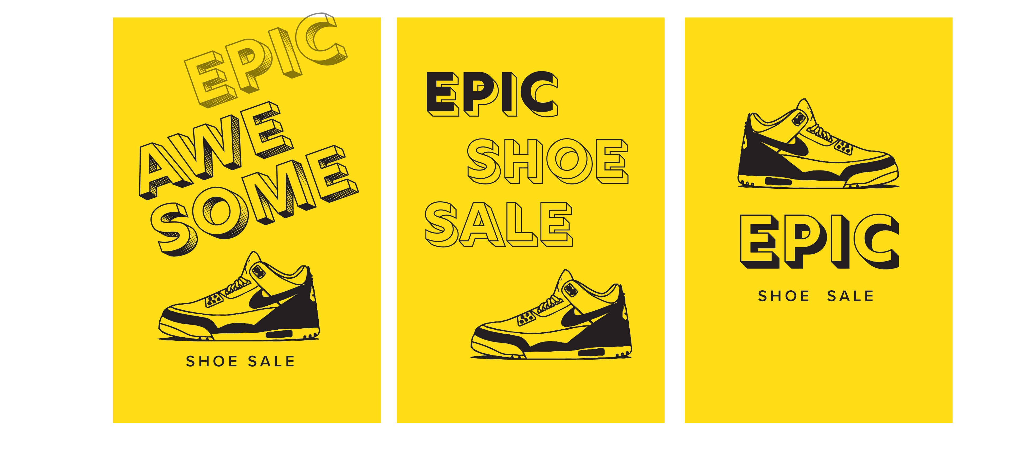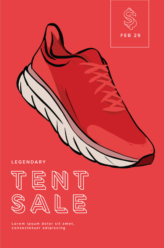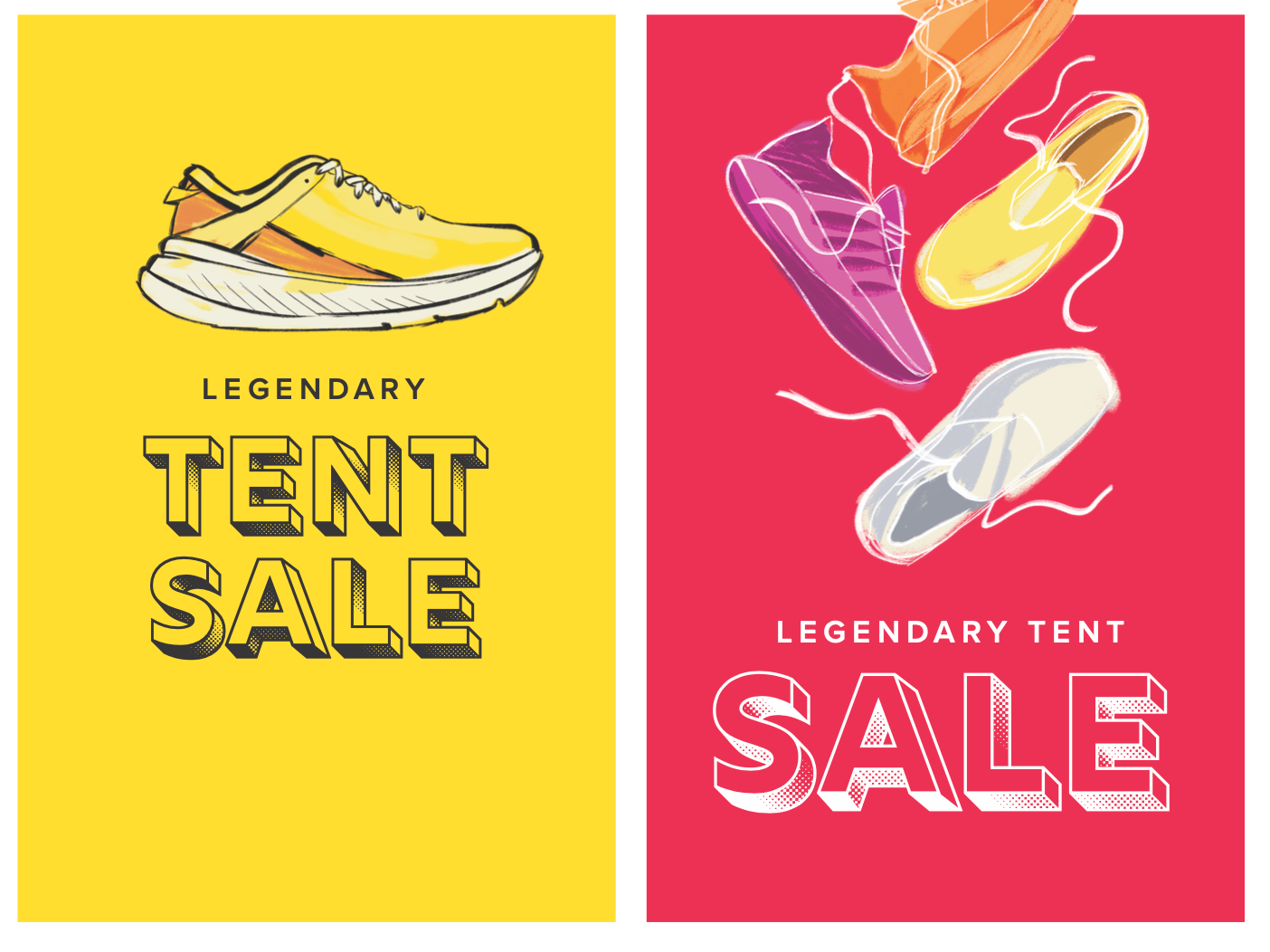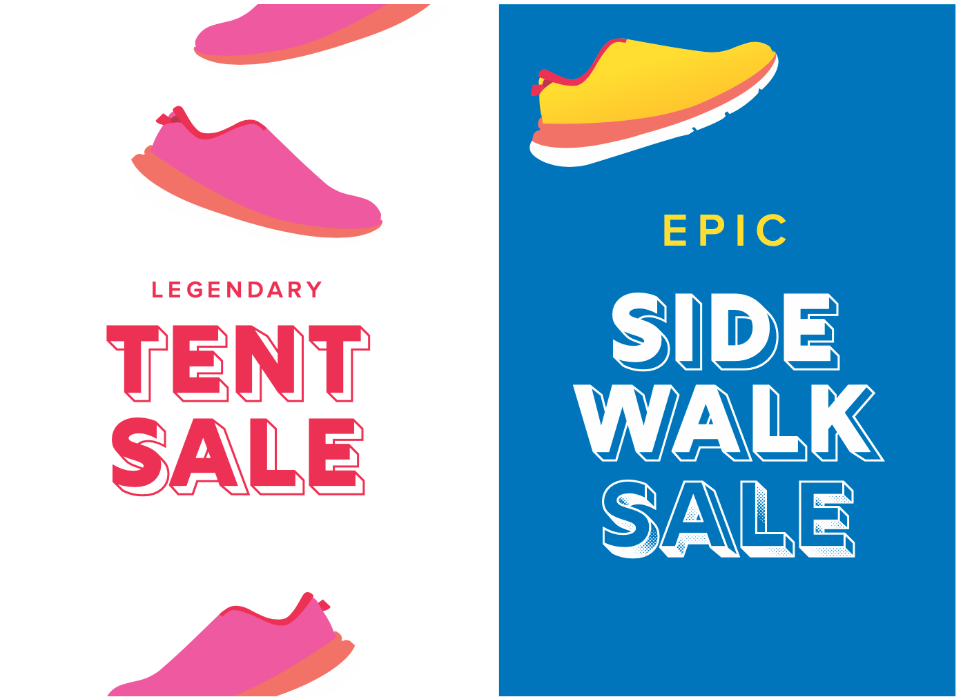 Below: Option 1 mockups featuring illustrated shoes. The CEO requested bright colors and shoes that read as generic and not specific to any one brand. As the concept evolved, the shoes were refined and rebuilt as vector artwork in Adobe Illustrator.