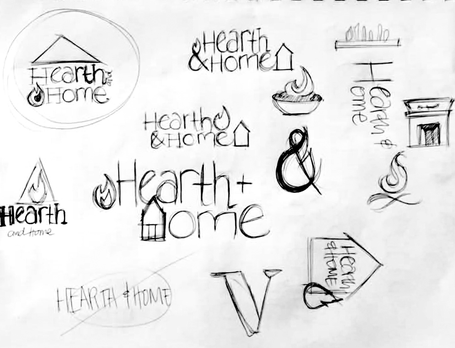I played with triangles to symbolize "home" and flames to symbolize "hearth." I thought about using a traditional fireplace, like the original logo, but I didn't like how heavy that felt.