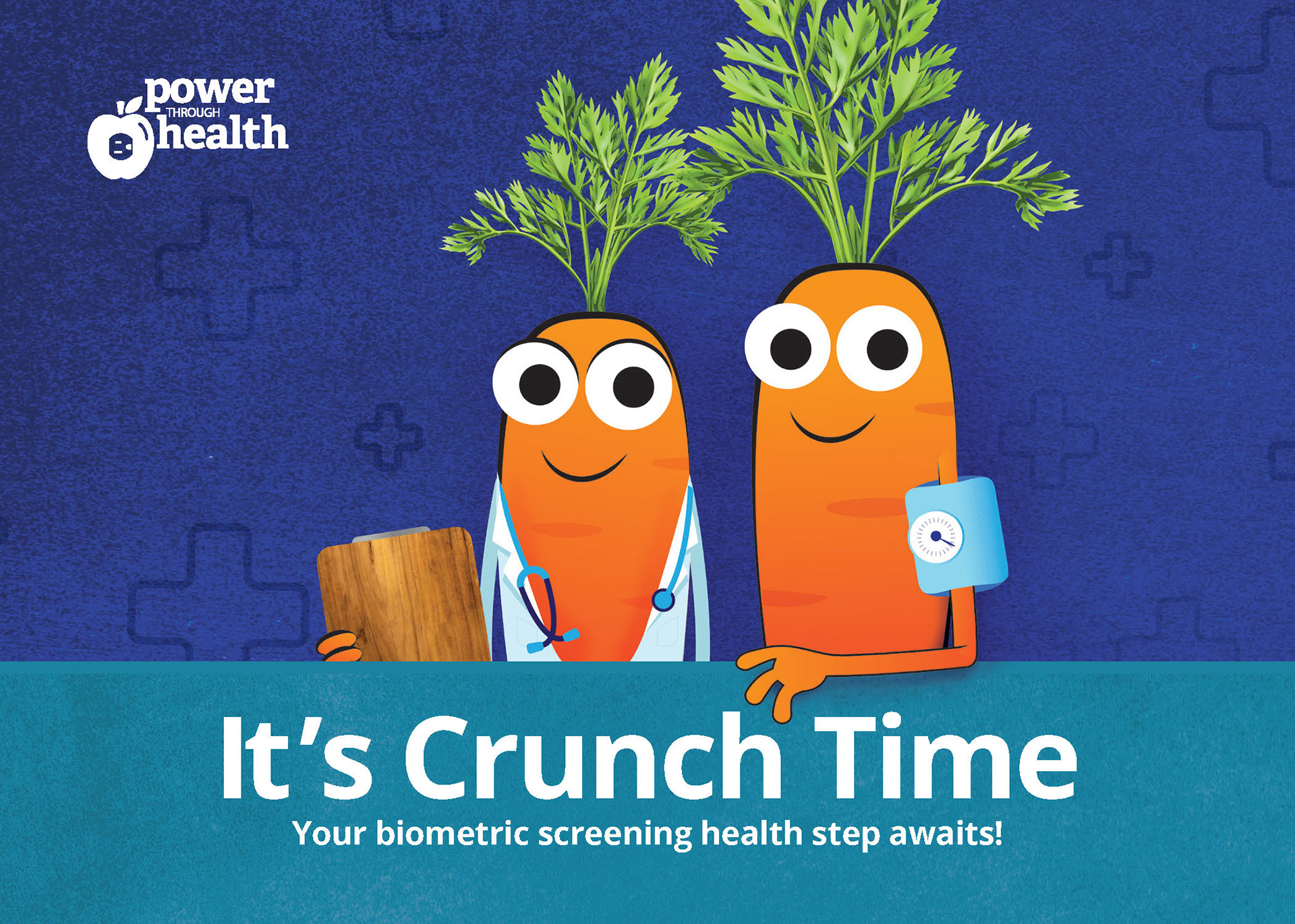 The carrot character was the first to be approved by the client. In order to communicate the concept of a biometric (wellness) screening we experimented with making one carrot the nurse / doctor and the other carrot the patient. Photographic texture for the leaves, clipboard, and backdrop was incorporated to add visual interest.